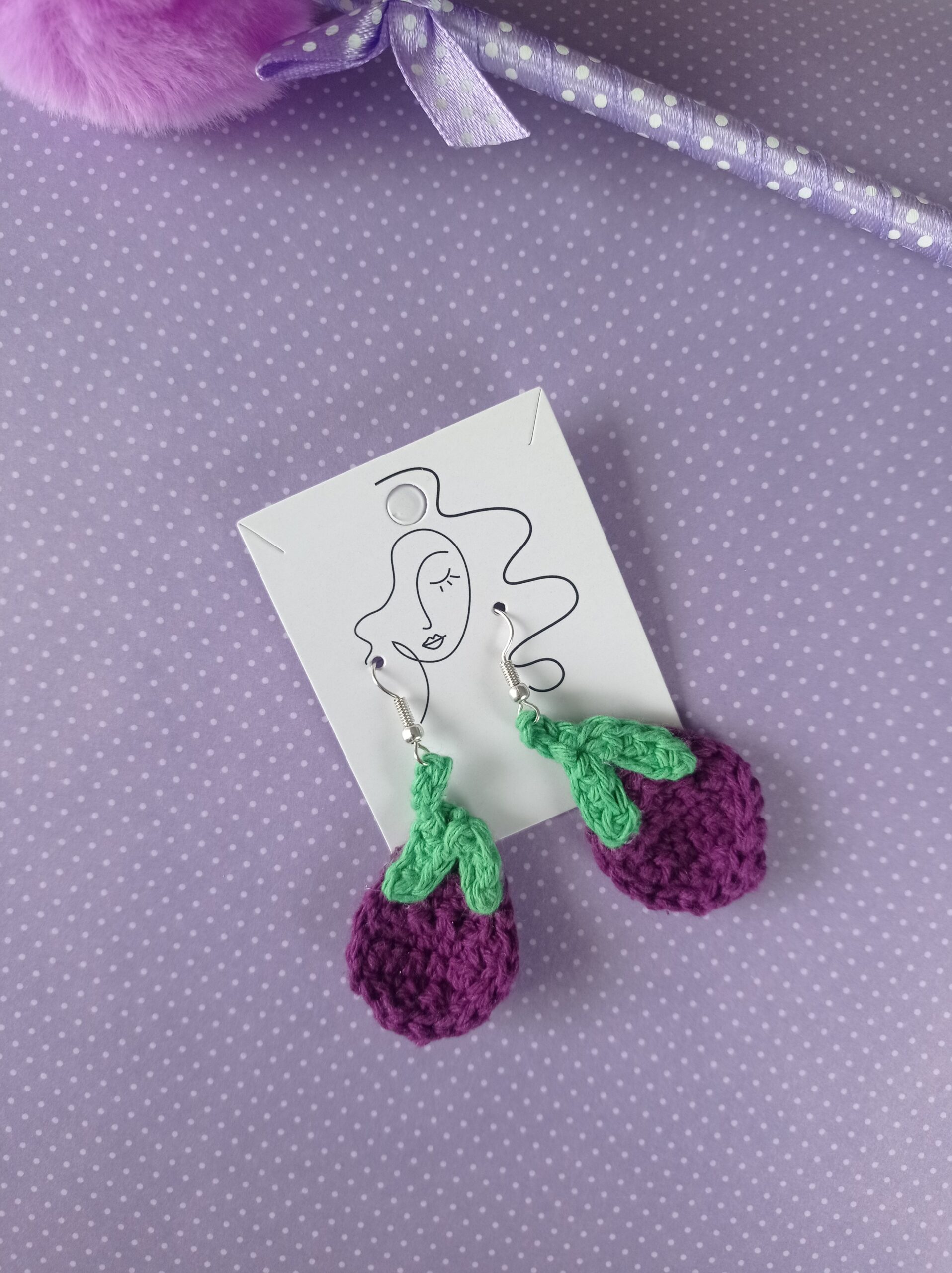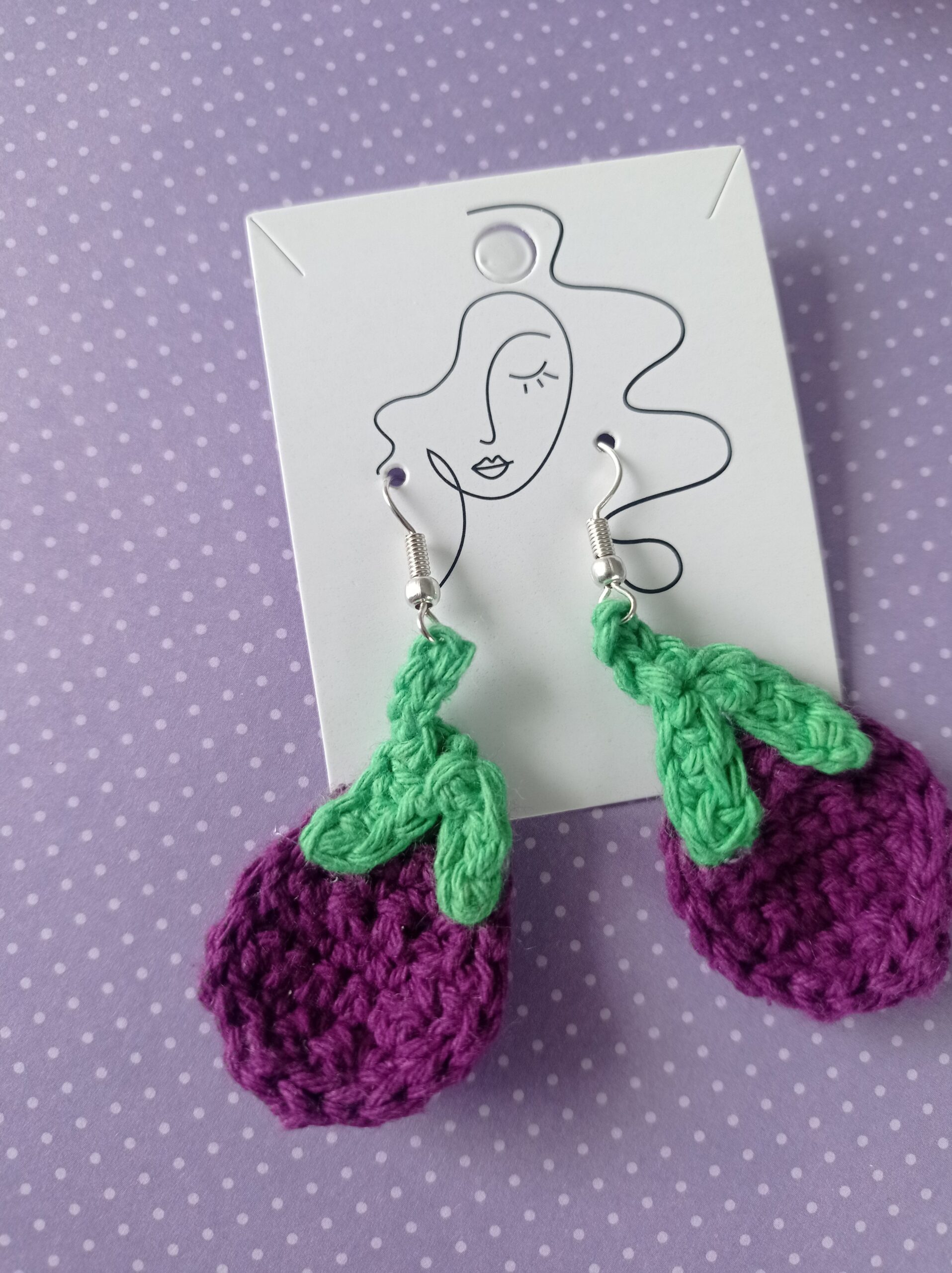 Très jolie bijou en forme d’aubergine adorable et méga mignonne crochetés à la main et avec un fil 100% coton.