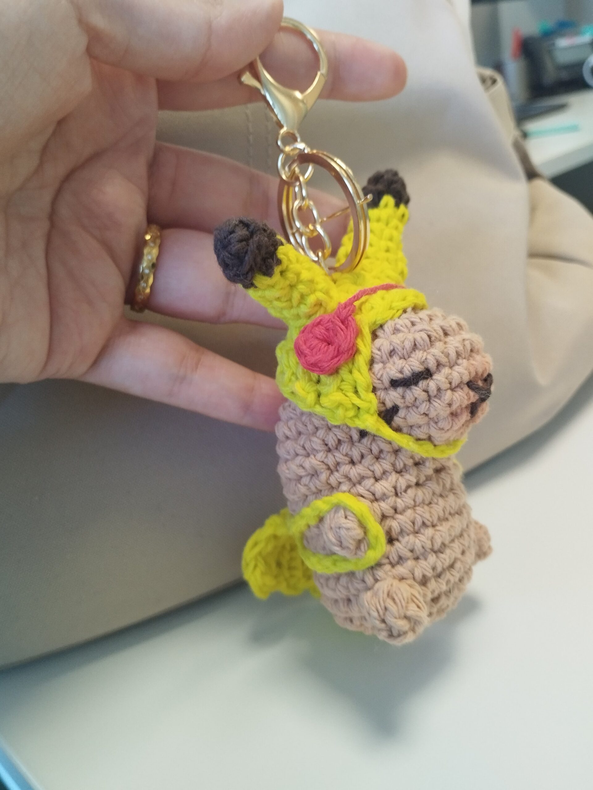 Porte clé en forme de petit capybara déguisé en Pikachu adorable et méga mignon crocheté à la main et avec un fil 100% coton.