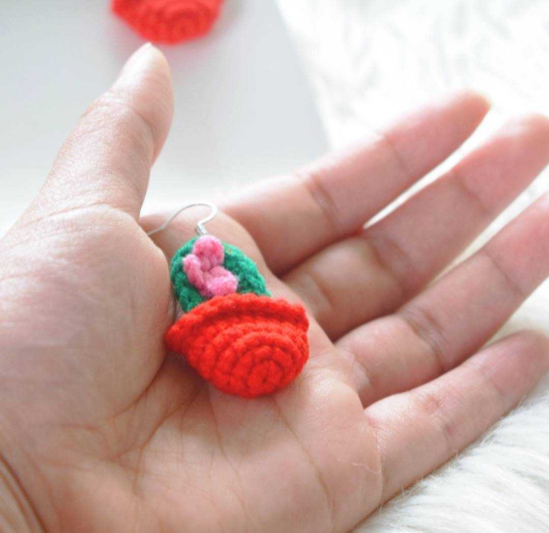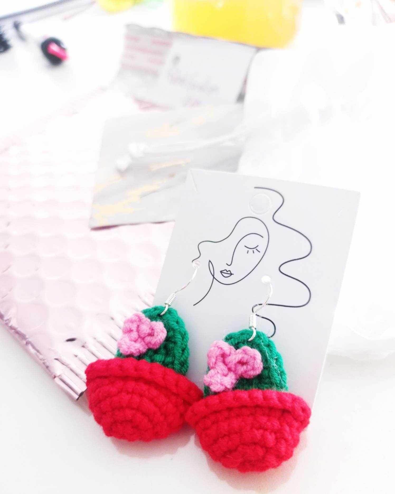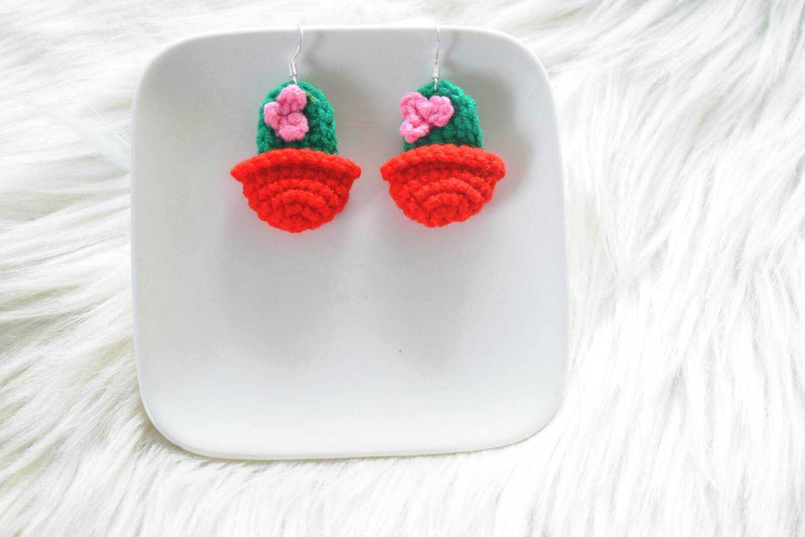 Très jolie bijou en forme de cactus dans un pot rouge méga mignon crochetés à la main et avec un fil 100% coton.