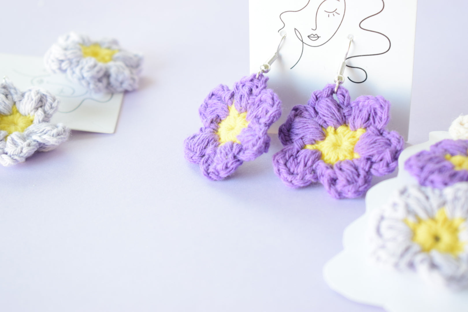 Très jolie bijou en forme de fleur en deux nuances de violet méga mignon crochetés à la main et avec un fil 100% coton.