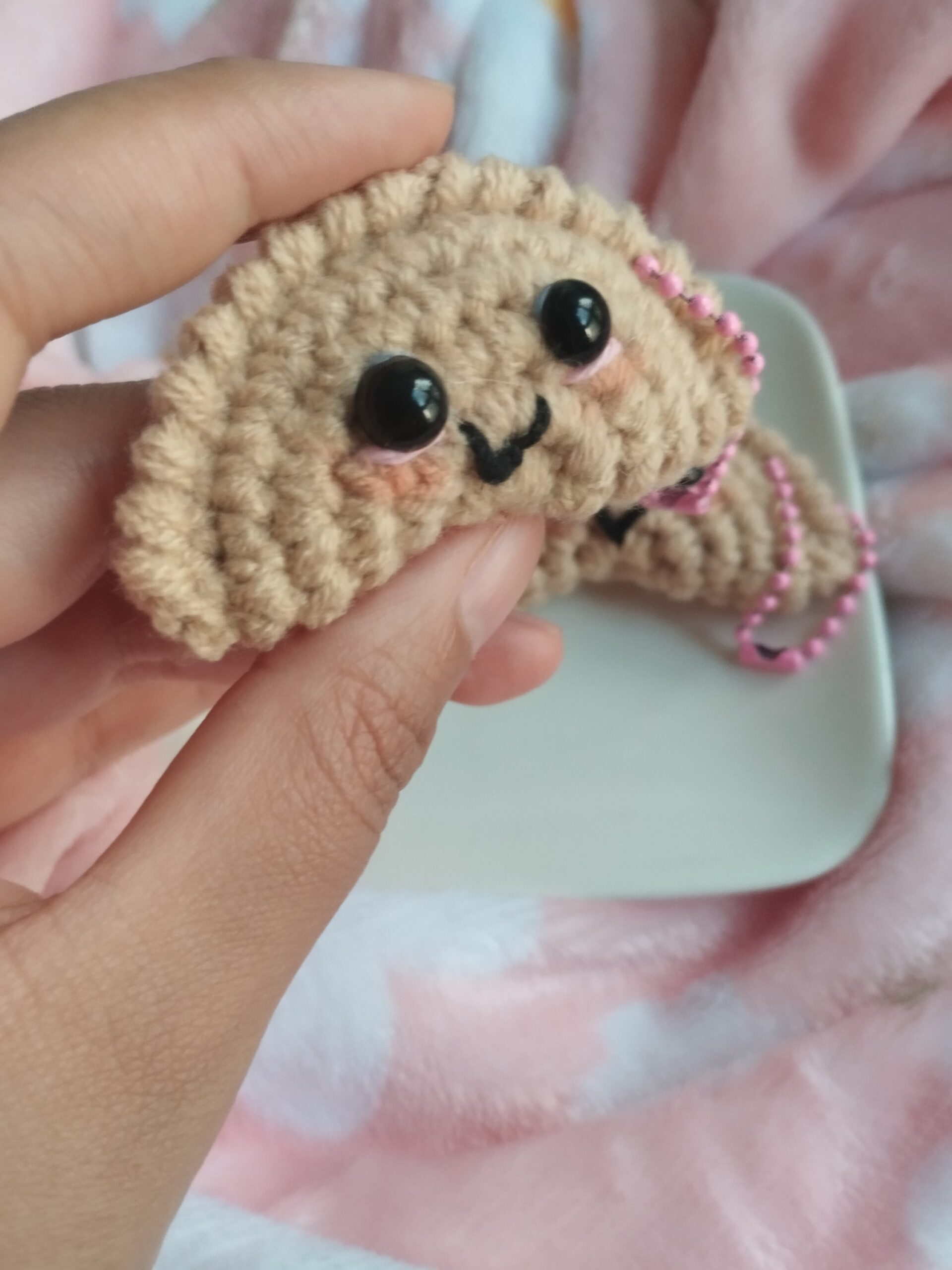 il est en forme de petit Gyoza adorable et méga mignon crocheté à la main et avec un fil 100% coton.