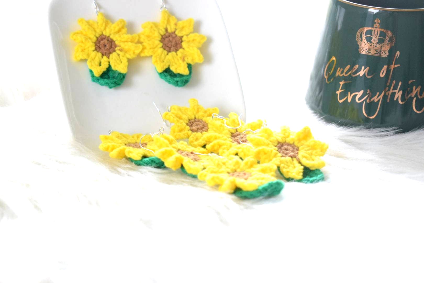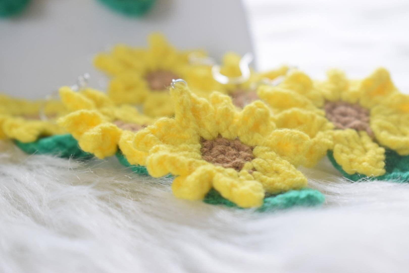 De très jolis tournesols crochetés avec un fil 100% coton qui donneront une touche fleurie et originale à vos tenues et sont tout à fait adaptées au printemps.